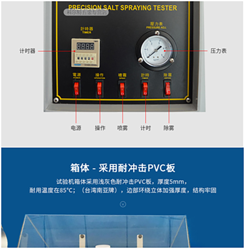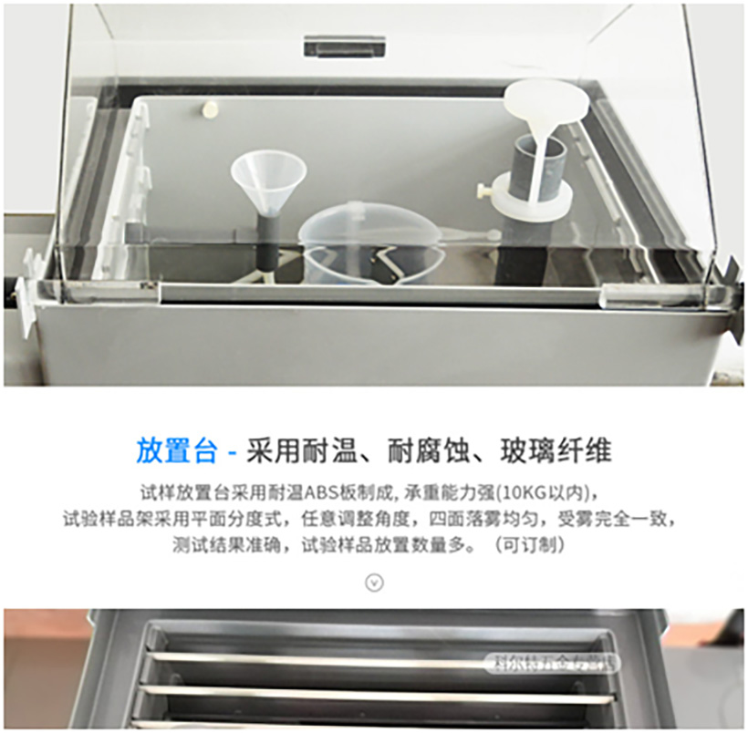 ☆盐水箱采用隐藏式附水位观察窗;箱盖为透明有机玻璃,保温良好且喷雾状态直视;